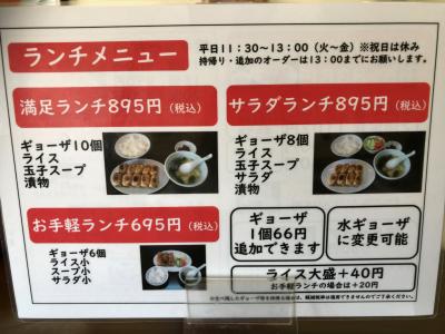 私はランチタイムに訪れたので、ランタメニューの満足ランチ(ライス・玉子スープ・漬物付き)を注文しました。餃子10個付きですが、1個単位で追加できるシステムになっており12個注文しました。