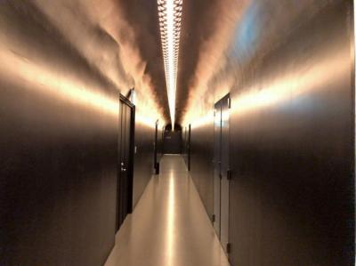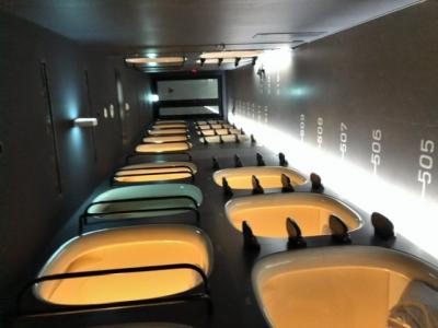 フロントでカードキーもらって、廊下奥に進み突き当たり左側に男性ロッカールーム、トイレ、シャワールームがあります。客室は手前右側のスペース、どちらへ入るのにもカードキーをかざします。