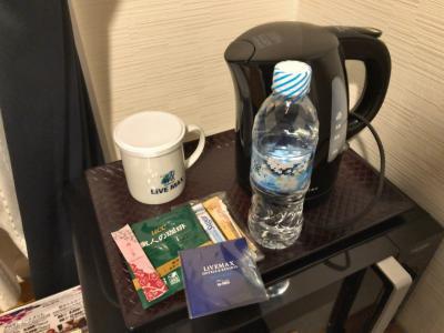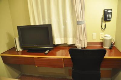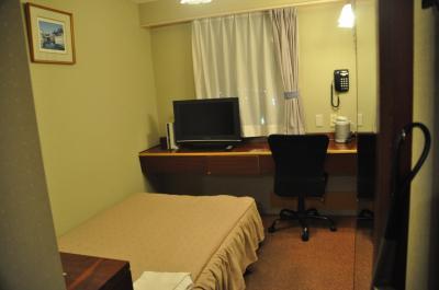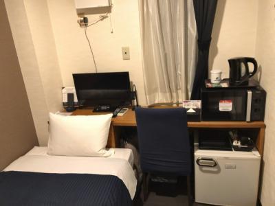 部屋は狭めでベッドが大部分を占めていますが、冷蔵庫に電気ポット、電子レンジ(ビジネスホテルでは初めてかも)も設置されていました。タコ足配線は気になりましたが。
