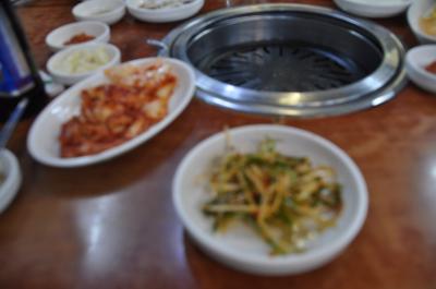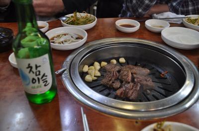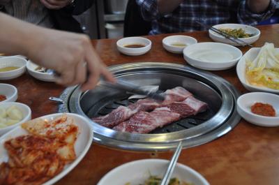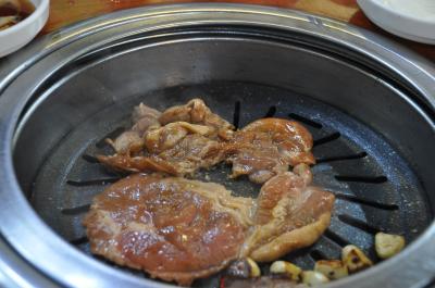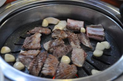 はじめに、生カルビ、味付けカルビ、牛のあばら肉を注文、店員が手際よく焼いてハサミで切ってくれます。また、一緒にニンニクもたっぷり焼いてくれます。