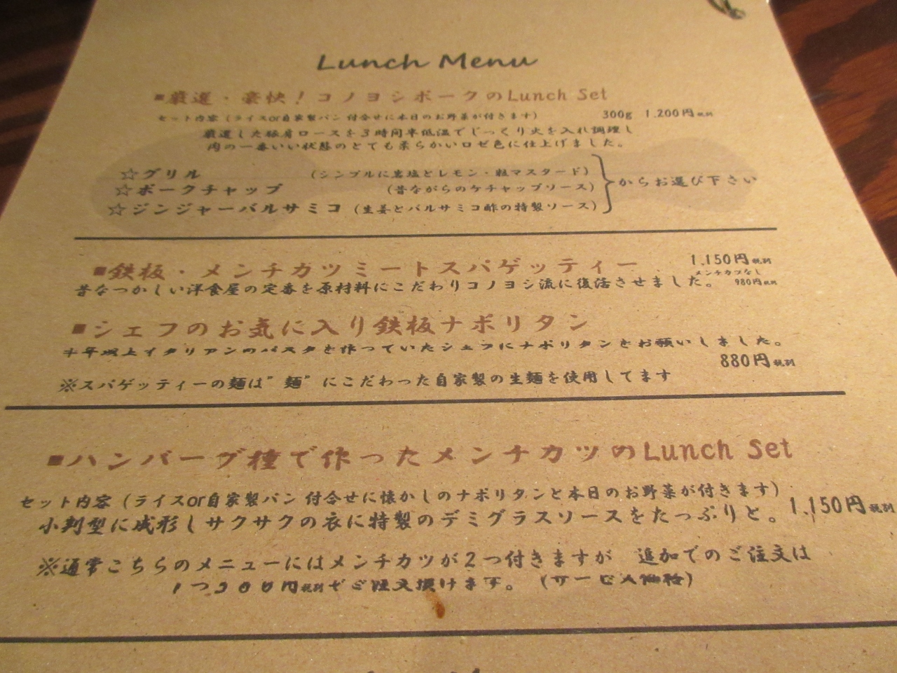 コノヨシポーク、メンチカツ、鉄板ナポリタンなど。