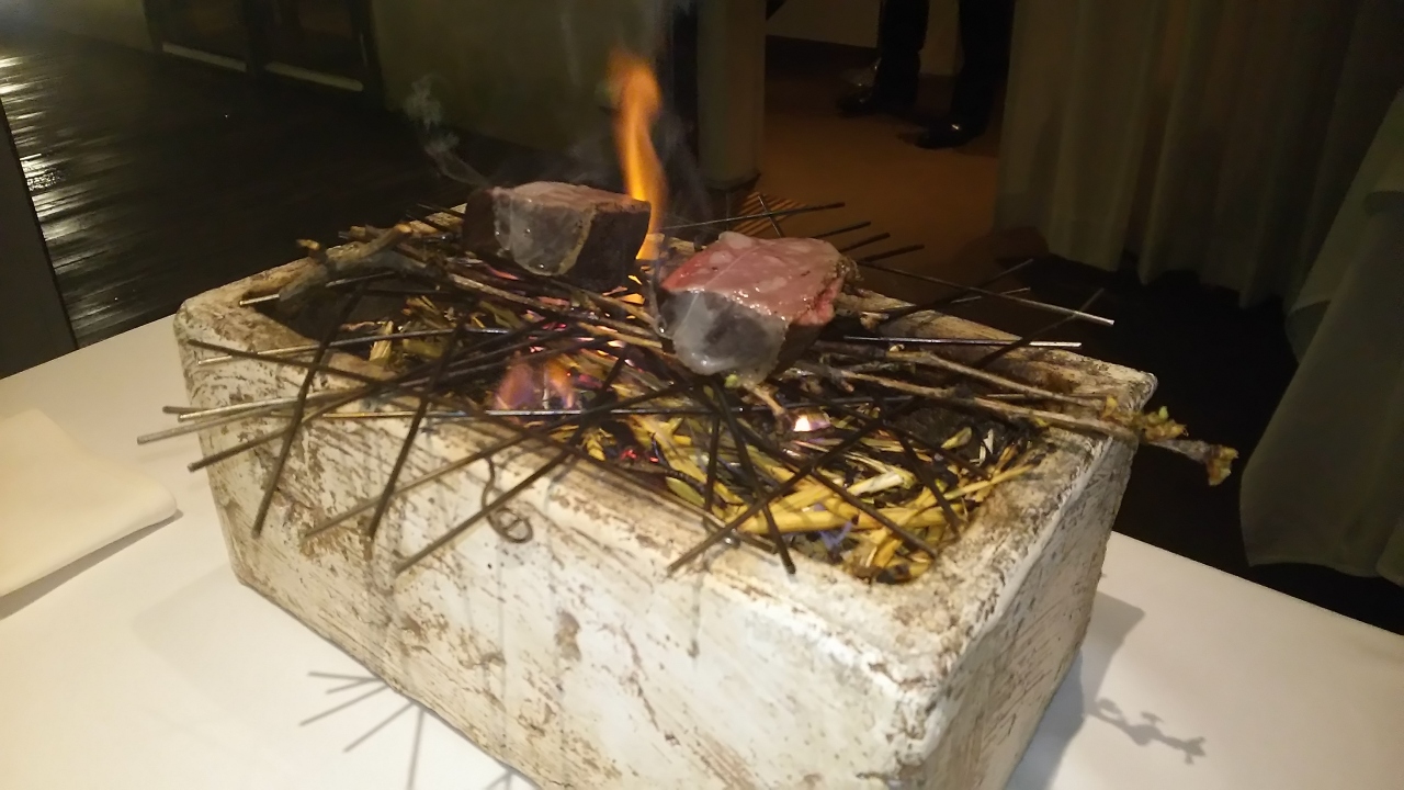 目の前で焼き上げる鹿肉など