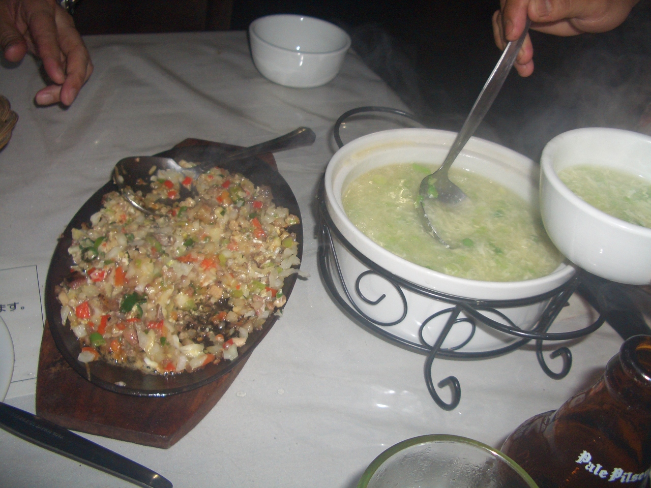 注文した物: サンミゲール2本、シズリング・シシグ、空芯菜炒め、BBQチキン、