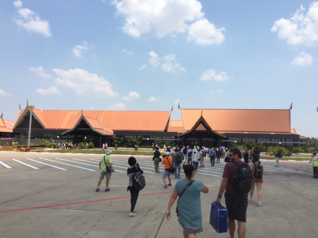 着陸した後、飛行機から徒歩でターミナルまで歩きます。ターミナルはアンコールワットらしい建物です。私たちはe-visaをあらかじめ登録していたので、arrival visaのレーンに並ぶ必要はありませんでした。arrival visaのレーンは結構行列ができていたので、並ぶのが嫌な人は事前に登録しておくべきです。ターミナル内はエアコンは効いておらず暑いです。入国審査の人が愛想悪くてびっくりしました。カメラで顔を撮影され、指紋もスキャンされます。荷物もなかなか出てこなくて遅かったです。