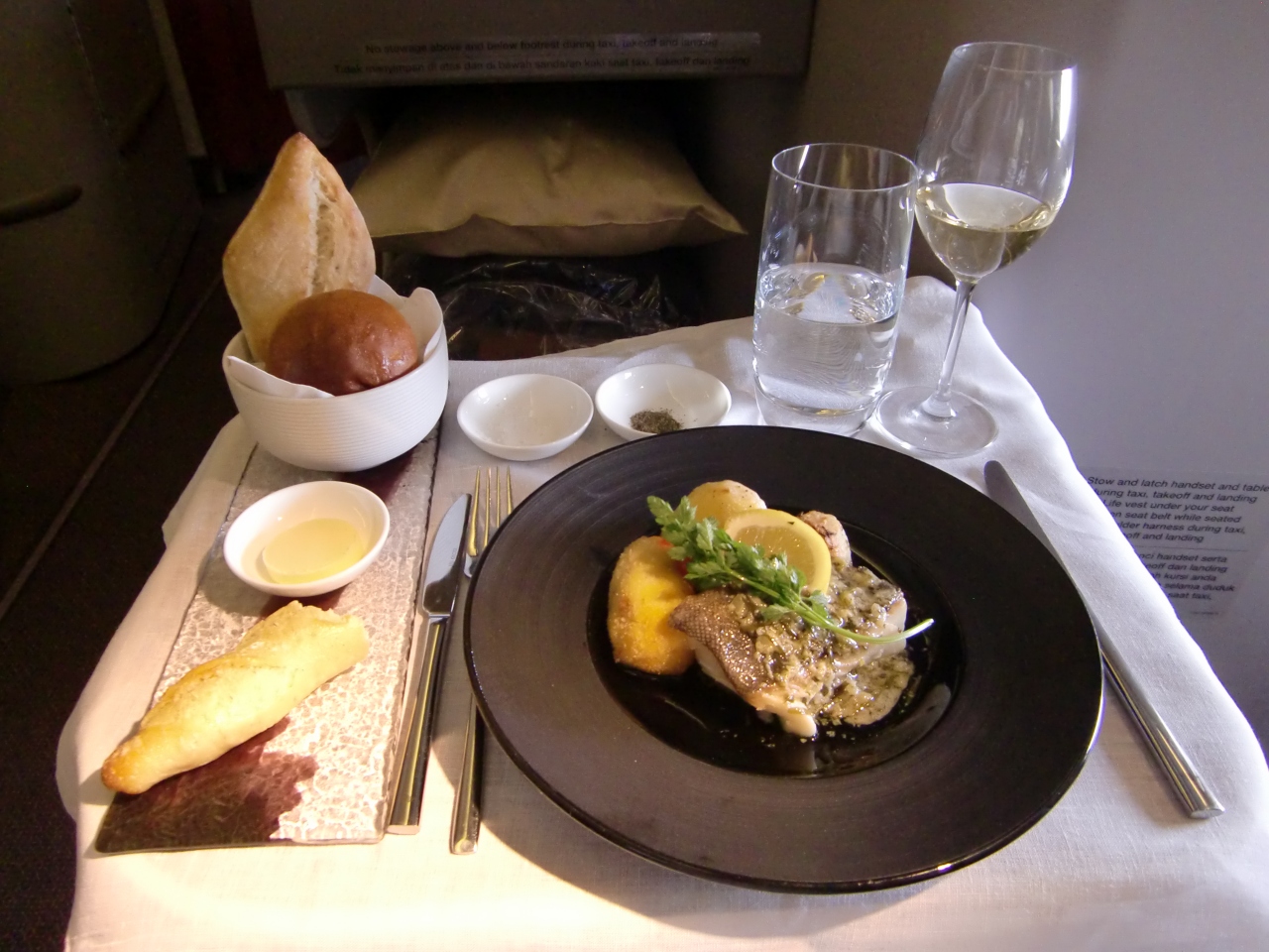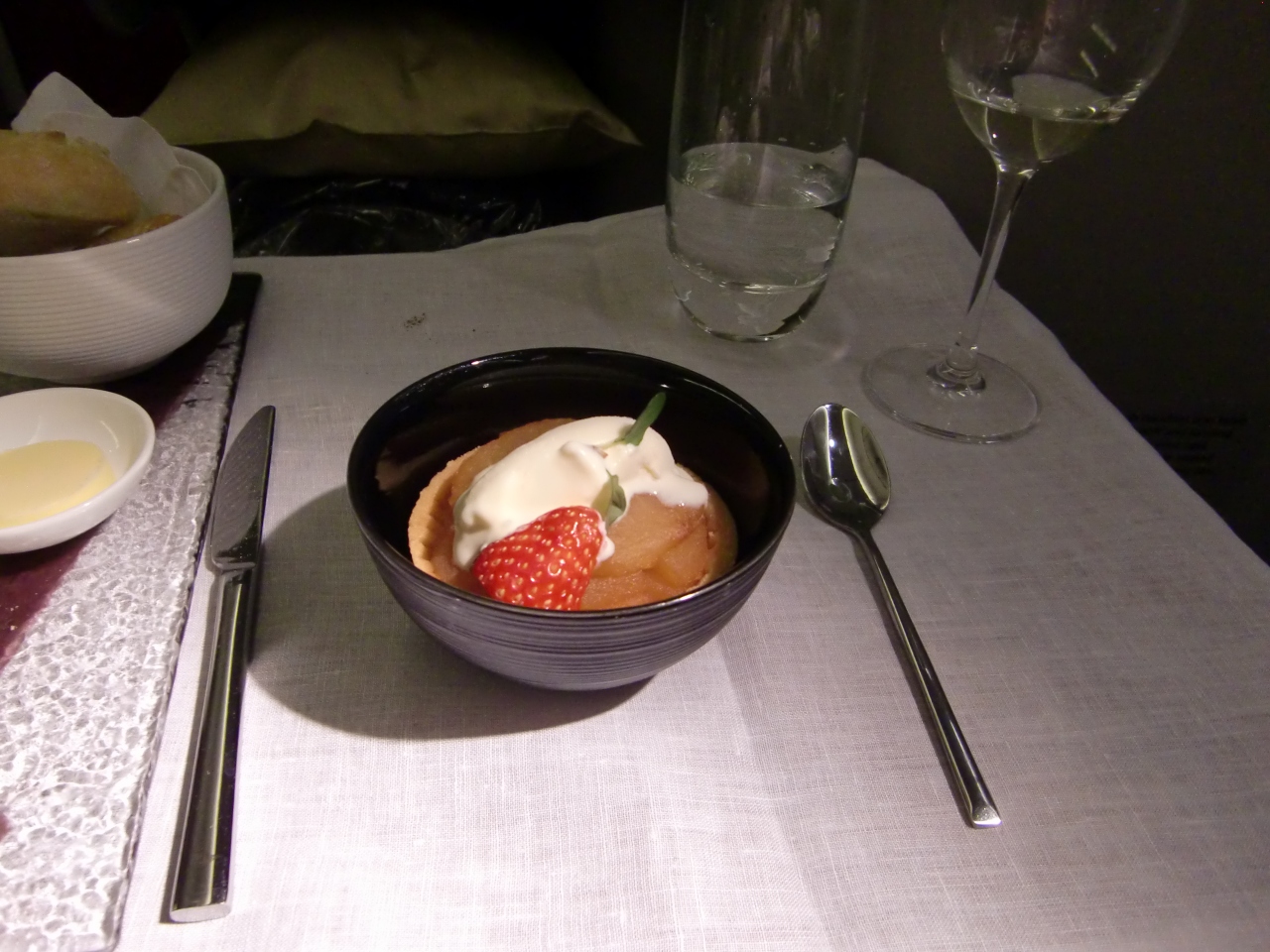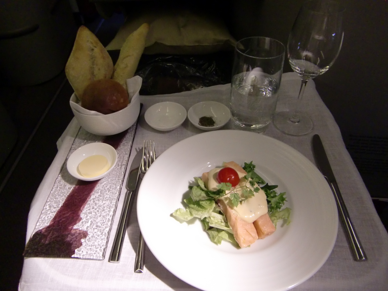 機内食は洋食を選び、前菜、メイン、デザートとお皿を変えて