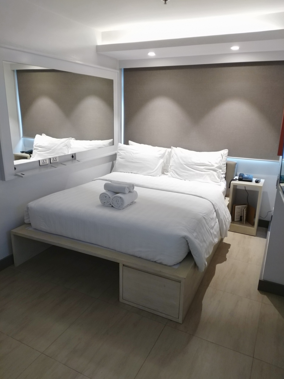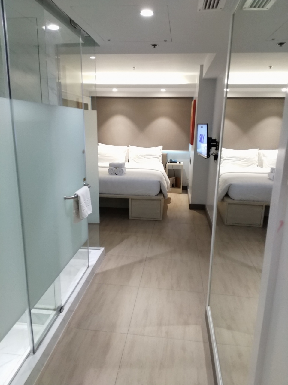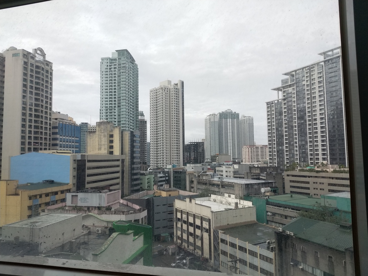 マカティのオフィス街の中心部にある高層ビルの中にあるホテルです。宿泊した部屋はバスルームがガラス張りだったので2人で泊まってたら気を遣いそうです。壁も薄くて外の音が筒抜けでしたが値段が値段なので寝るだけと割り切れました。
