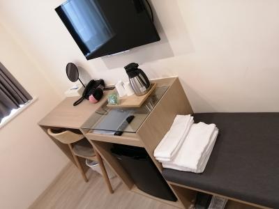 冷蔵庫、ポット、タオル等必要なものはそろっているが、紙コップがもう少しあればよかったかな。酒用、コーヒー用、洗面用で3つずつ欲しい。