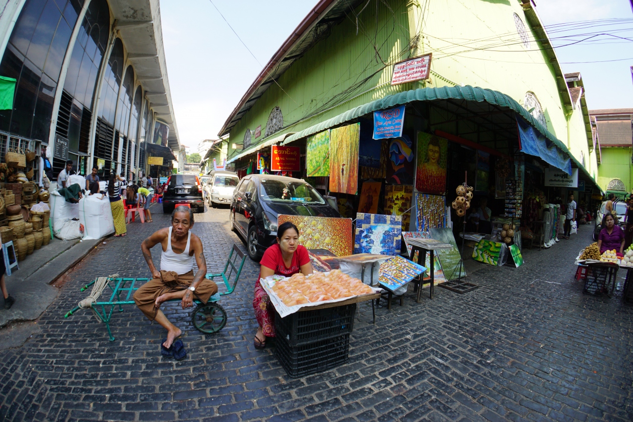 ボージョーアウンサン通りに面したヤンゴンの中心地に位置しており、道の上を通る歩道橋を渡ると、この市場とは対照的に、超近代的なモールがあったります。