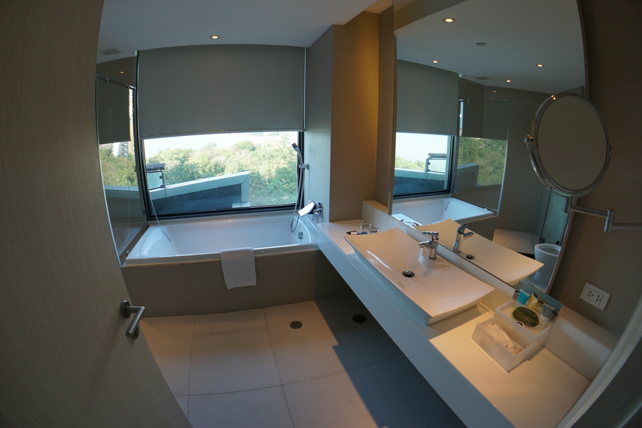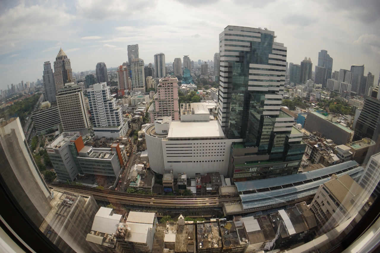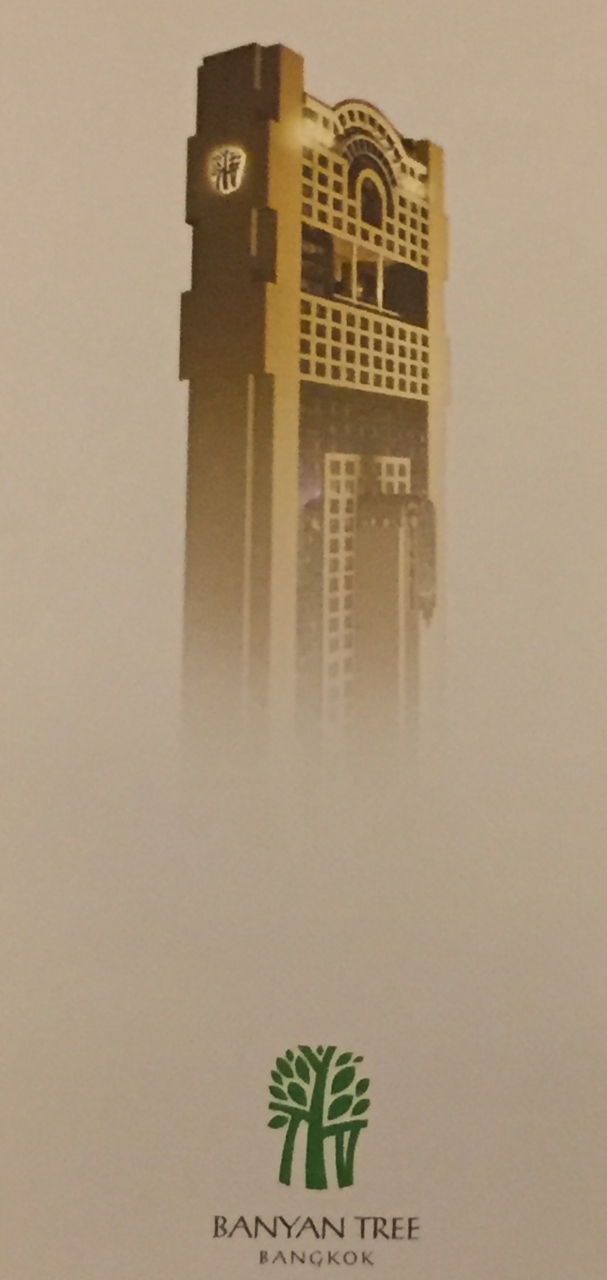 バンコクのビジネス街:サートン通りに野村證券の看板が目立つビル(YWCA)の裏側に、ちょっと奇抜なノッポビル、それが60階建て216室のバンヤンツリーバンコクです。1997年に建てられたんだそう(もう意外と古い)。