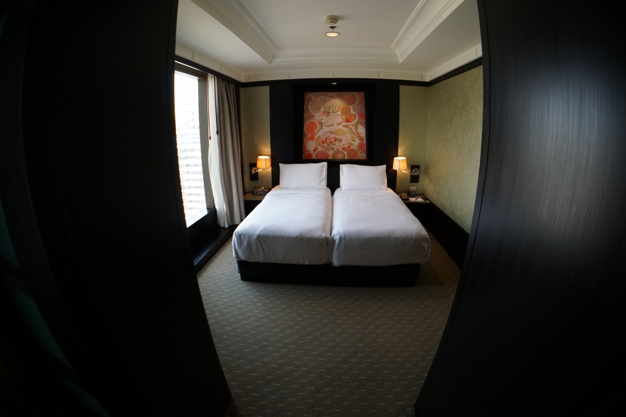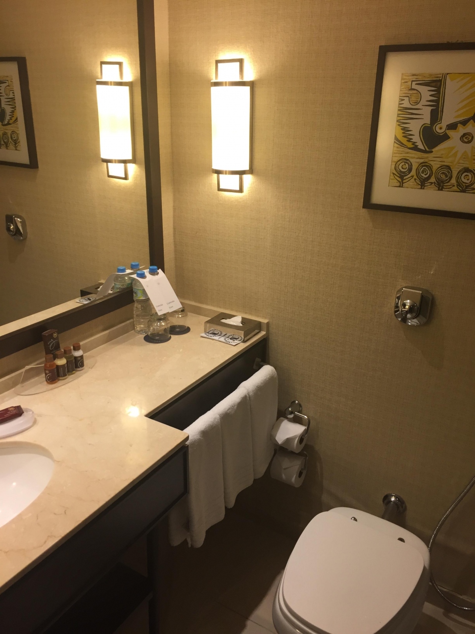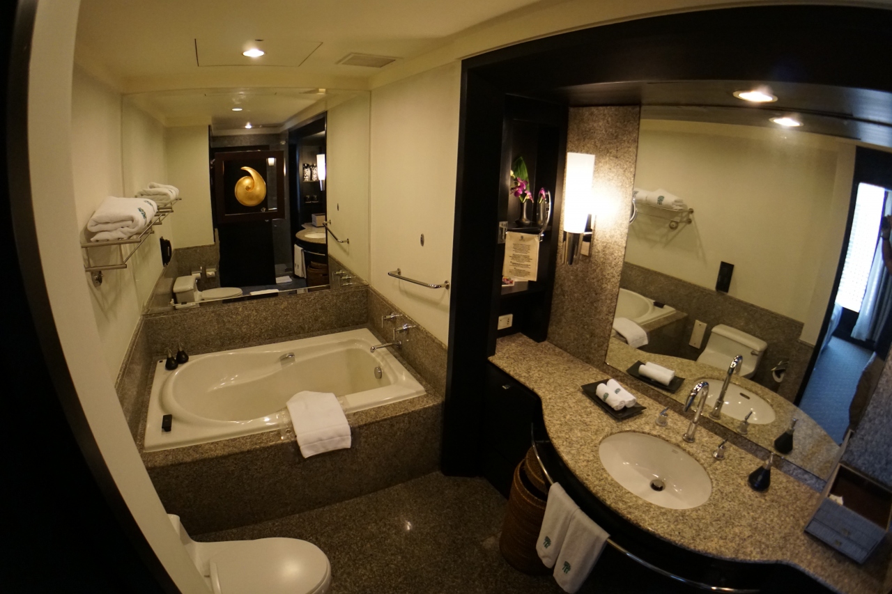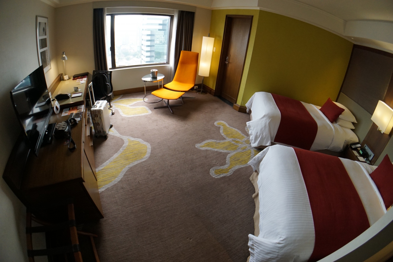 ただチェックイン時(14:30前後)、ちょっと問題発生。私が希望した高層階の掃除がまだ終わっていなっということで、ロビーで待たされる事約45分.......他の客もたくさん待たされていたので、時間が悪かったのか?.....アレンジが悪すぎるのか?.....こんなでかいホテルなんだからいくらでも代わりの部屋は手配できそうな気が.......しかも、案内されたのは、客室としては低層の33階......待たせてこれかよぉ.....ホテルマンたちは、テキパキと素晴らしい動きをしている(様に見える)だけに、もったいない対応です......(一応、マネージングにクレーム入れておきました)