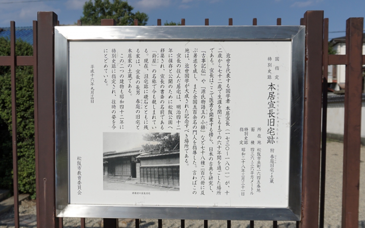 「....元々は松阪の町医者......医業のかたわらで、『源氏物語』や『古事記』を研究し、松阪の地で数多くの著作を発表した.....門人の数も多く、記録によると、門下生は500人近くにおよぶ人々の名前......その階層も町人、農民、武士と幅広く......全国に及んでいました........そして独学34年の歳月を経てついに『古事記』の解説書、『古事記伝』44巻を完成させ、国学を大成.....その他、1801年に亡くなるまでに約270冊もの本を書いた国文学者......」