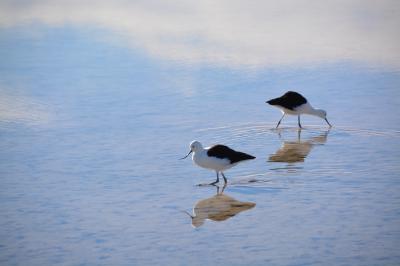 静かな、波立たない塩湖にフラミンゴたちが、安心して餌を啄み、本当にここは「ウユニ塩湖か?」と思う様な、空と湖の景色が同化した光景なんです....。