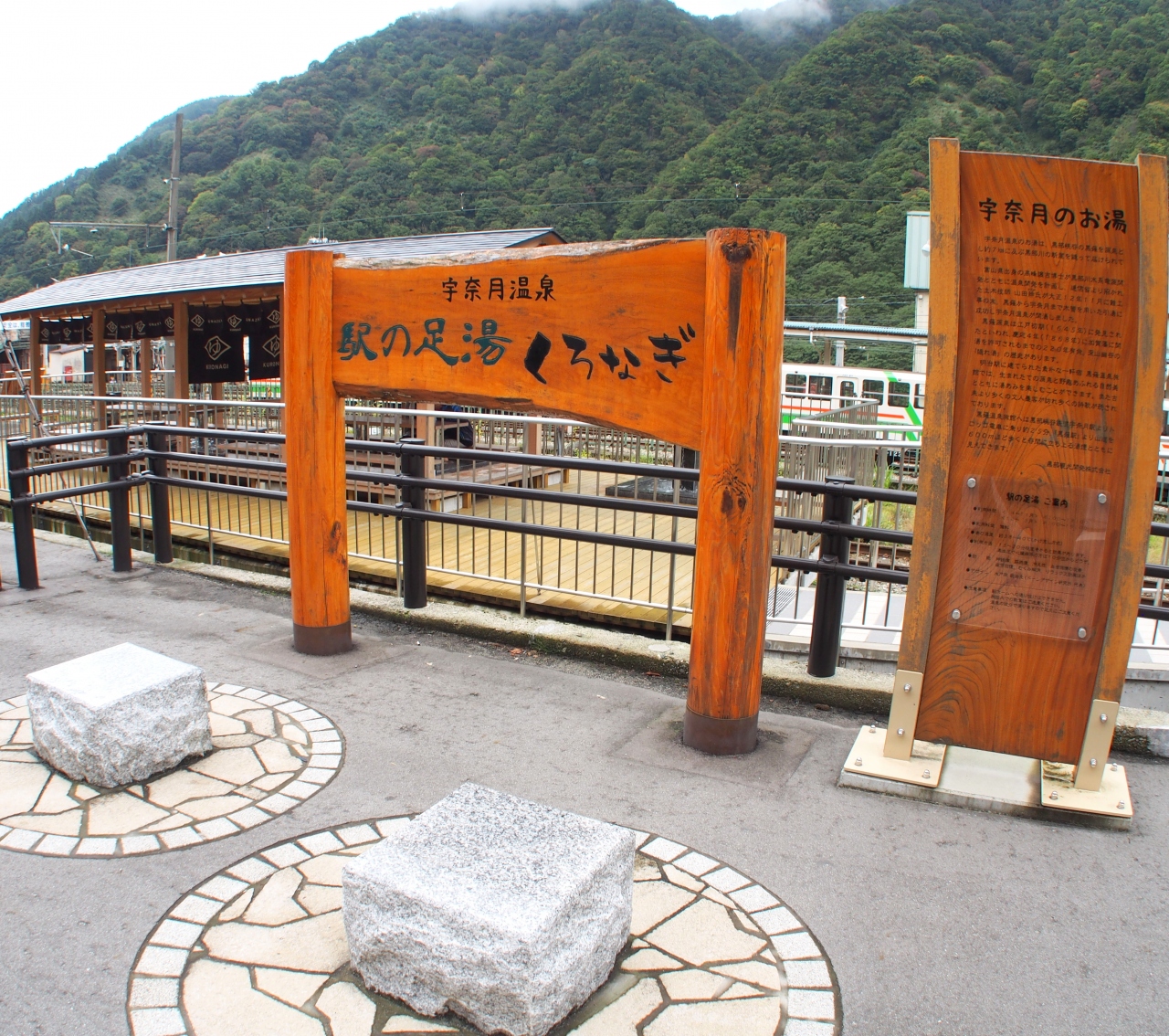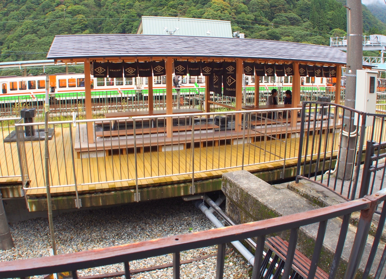 2016年にできたホーム上の足湯「宇奈月温泉 駅の足湯 くろなぎ」の前にあるだいだい色が目印の喫茶店が、ここカフェ・ボンフィーノ宇奈月店です。