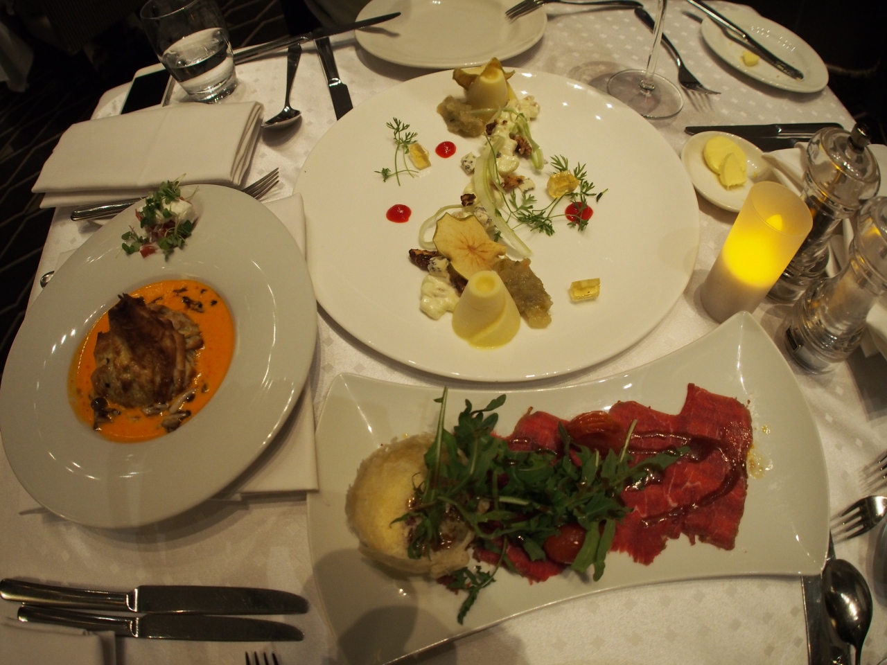 実は、夜、フェリー内のレストラン(食堂)で夕食を食べ始めている頃は、何事も無く、普通に各テーブル上で、団欒の光景が展開されているんですが....