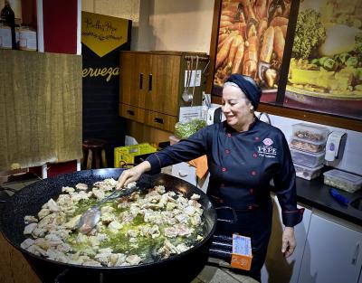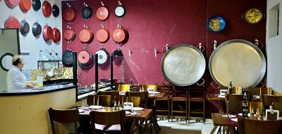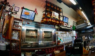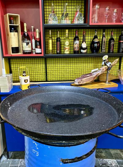 そんな場所にあるこのスペインのパエリア専門店。店も非常に凝っていて、シェフのお母さんが大きな鉄板に次々にパエリアを作り上げていく様子は壮観。出来上がると、頭の上の大きなベルで知らせてくれます。