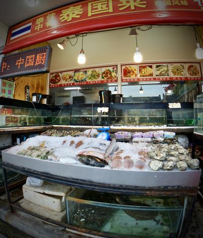 広場を囲むようにして料理(屋台兼台所)がある感じで...海鮮系、食材が並べられてた屋台があります。