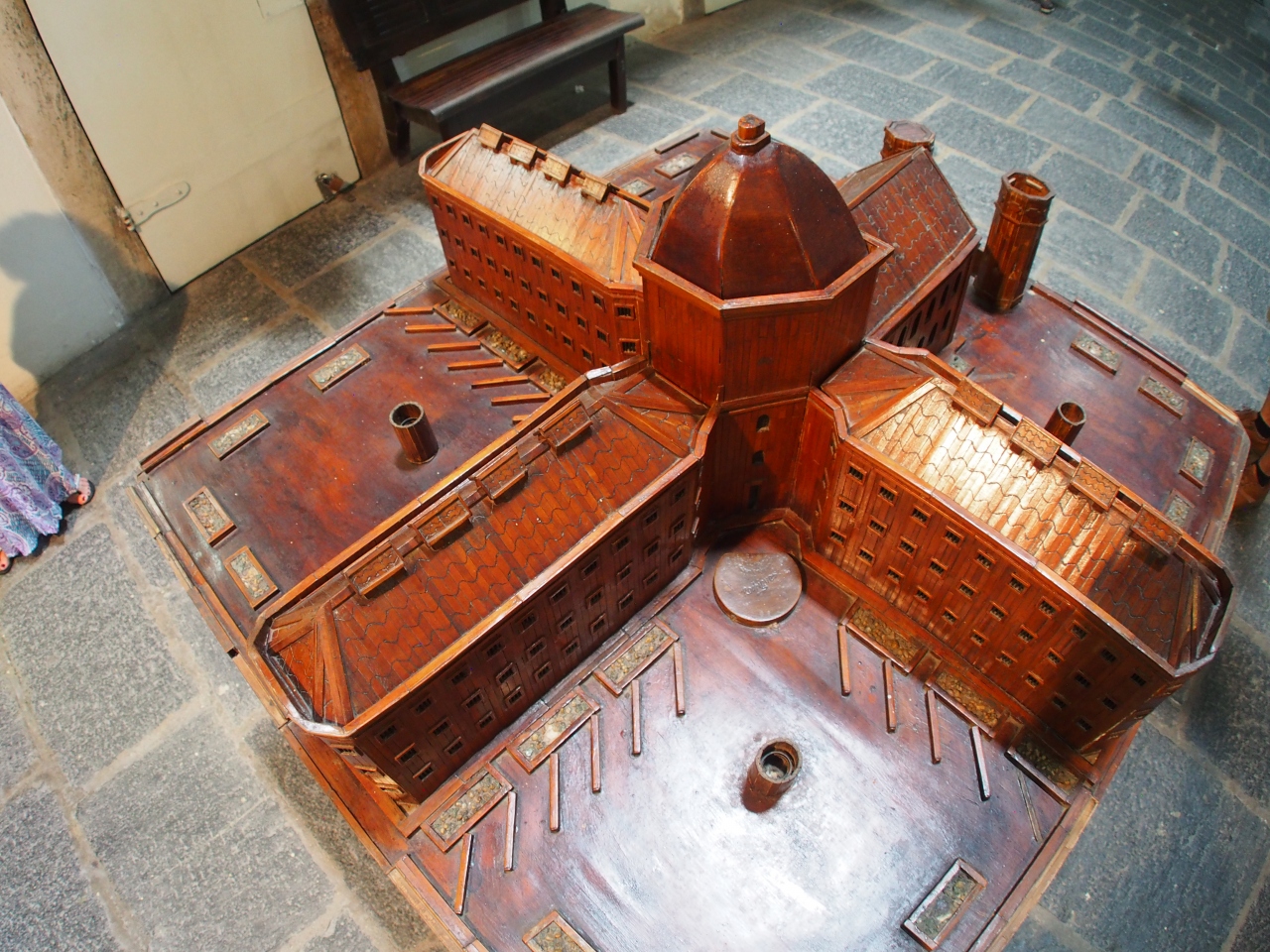 日本の網走刑務所は、上から見ると、「五翼放射状平屋舎房」という不思議な放射状ですが、この建物は、『十字架』の形をしているそーです(上から見えないけど、中に模型があります)。