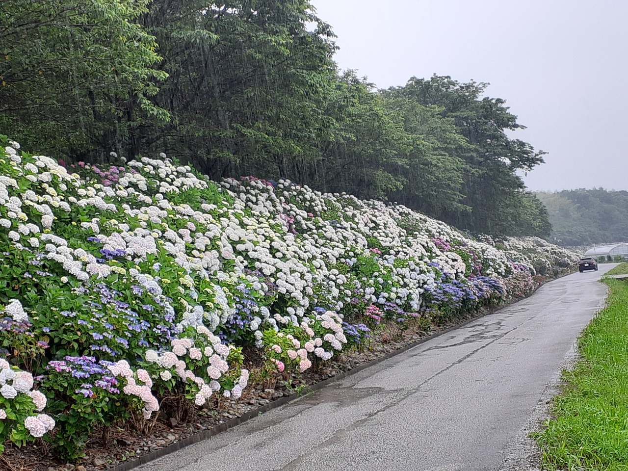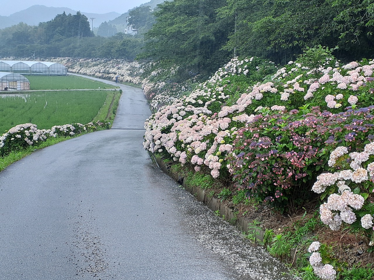田んぼに沿った土手の斜面を埋め尽くすように紫陽花が植わっています。