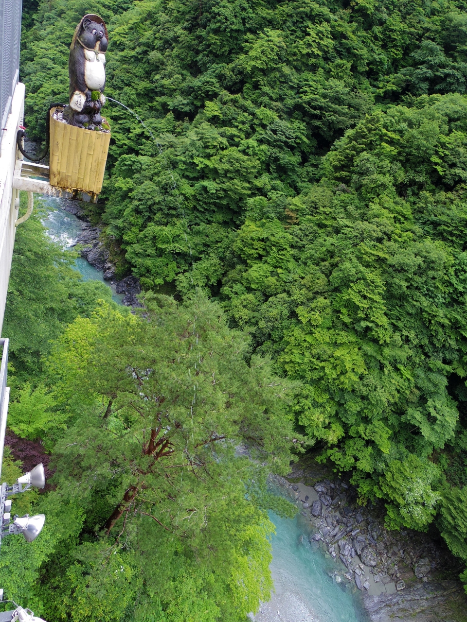 テラスの外側の空中に小便たぬきが置いてあり、祖谷渓に向けて涼しい顔でお〇っこを放っています。