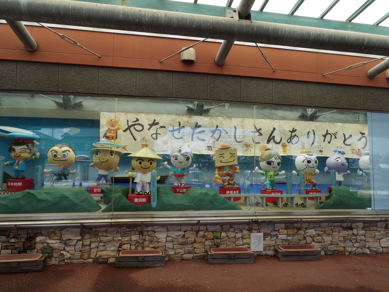 やなせたかしさんの、ごめんなはり線のキャラクター達たちが飾られたショウウィンドウが一番の見所だと思います。