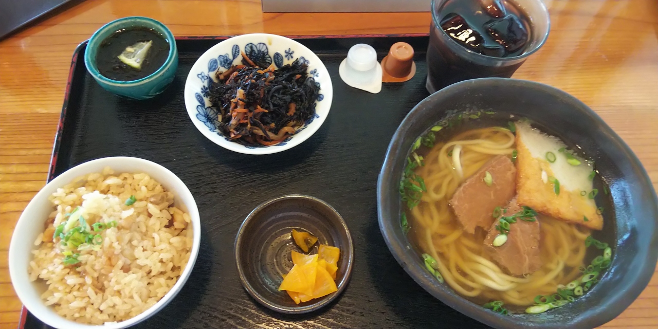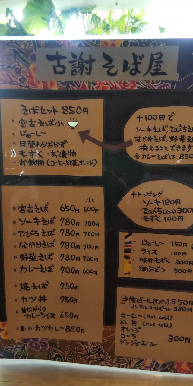 お勧めの「そばセット」を注文 宮古そば(小)にじゅーしーや小鉢に飲み物が付いて850円と大変お値打ちでした