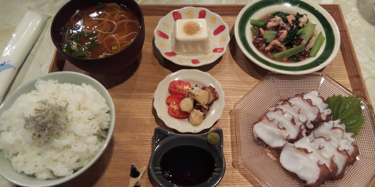 夕食は別途1100円で注文できます。 島でとれた名産のタコがふんだんに用いられてました。