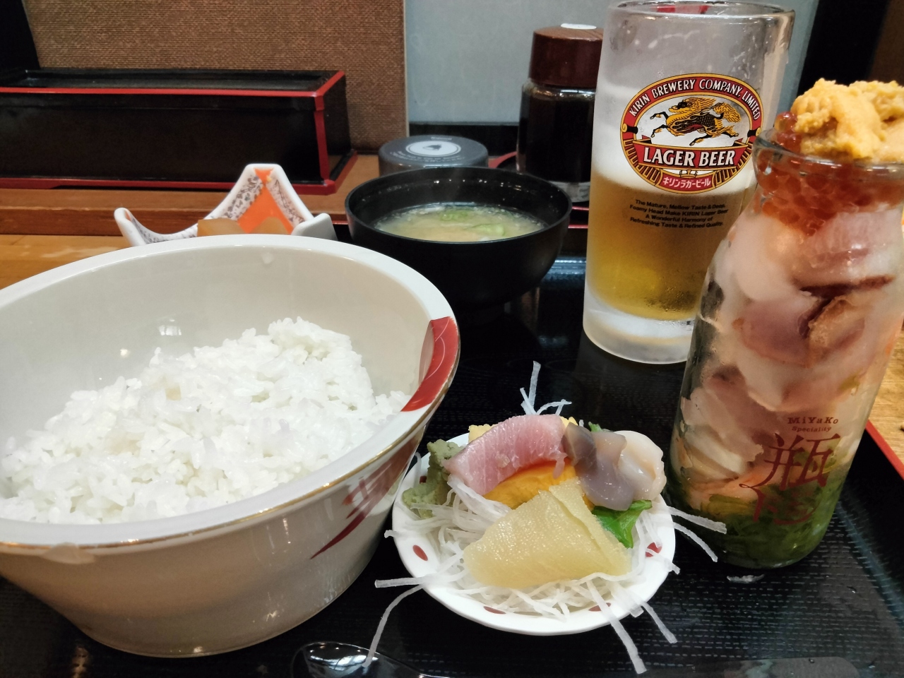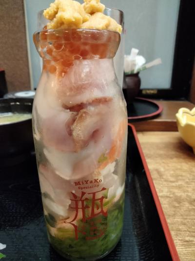 「瓶ドン」とは牛乳瓶のような容器に地の海産物を入れ、好みで丼に盛り付ける宮古市名物の料理です。 市内で提供する店は何カ所かありますが、ランチのみの営業だったりして、夕飯時に瓶ドンが注文できる有り難いお店です。