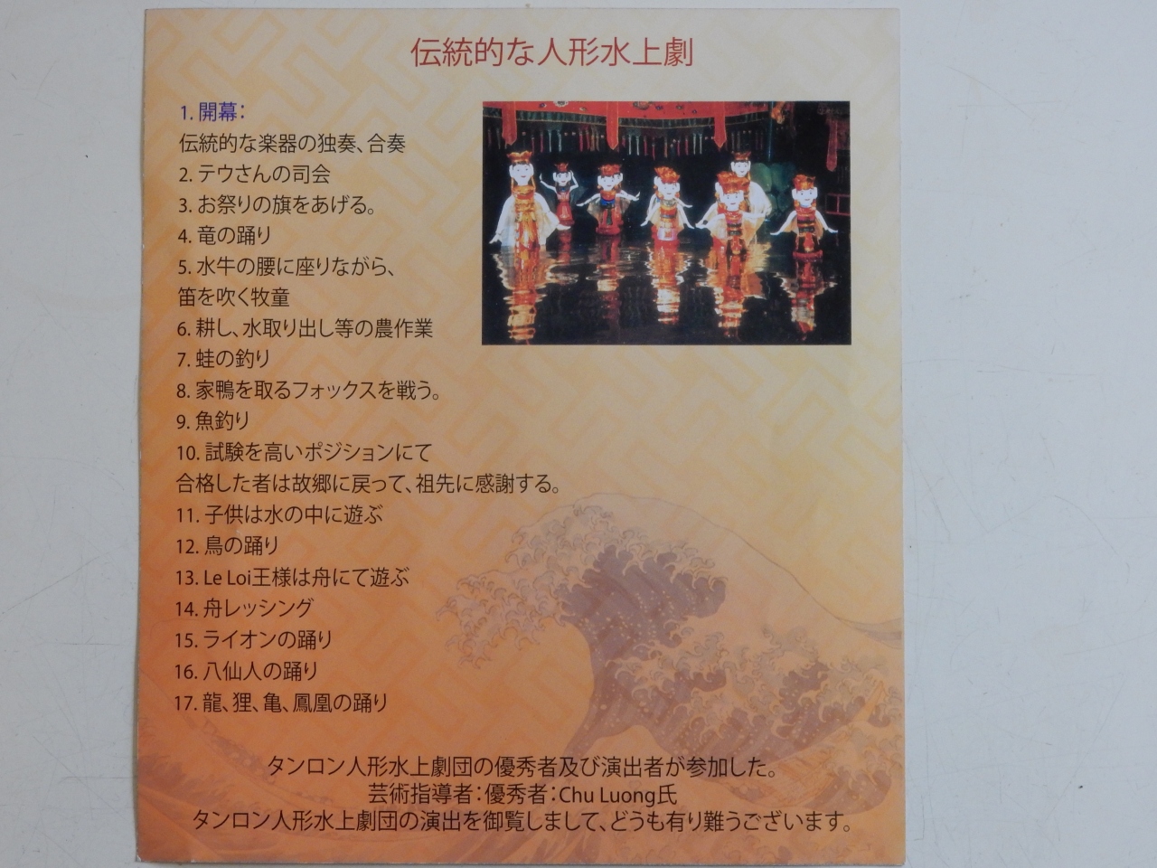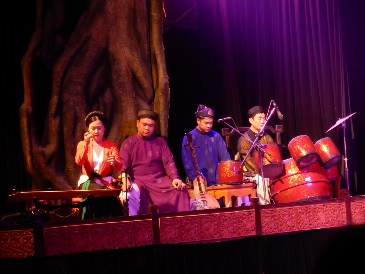 水面のステージで人や動物の形をした人形たちによる人形劇なので、あまり期待していなかったのですが、ストーリー性や人形のコミカルな動きに加えて伝統楽器を使った生演奏があり約50分間の上演を十分に楽しめました。