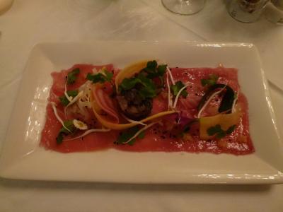 @マグロの刺身(カルパッチョ風):プレートに敷き詰められた美しいマグロの赤身。でも驚いたのはアジのタルタルが載っていること。このアジのタルタル、日本で言えばアジのたたきにレモンオリーブオイルで和えている。さっぱりとした美味しさで、今までの洋食に疲れた胃にやさしい♪