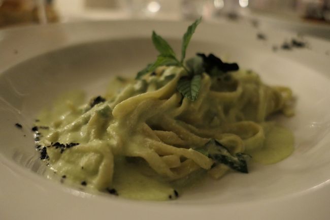 @ギターラパスタの空豆のクリーム ピスタチオ添え