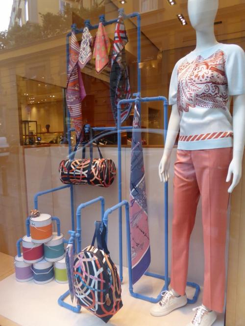 スカーフ柄の美しいスポーティーなバッグがウィンドーにたくさん飾られ、
