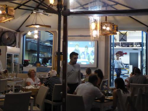 「Pizzeria del Borgo」というレストランは新鮮魚介を並べて賑やかにカメリエーレがアピール。