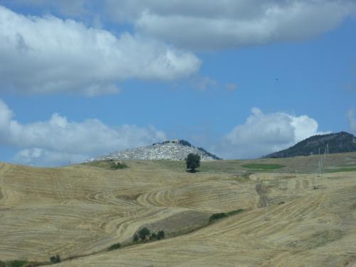 緩やかな丘が連なる風景に突然現れる宝石のような美しい白い町。