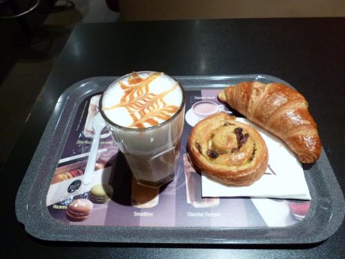 オーダーしたのはキャラメルラテマッキァートとクロワッサン2種。