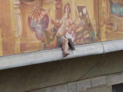 それは壁に描かれている人物の脚が壁から飛び出していること。