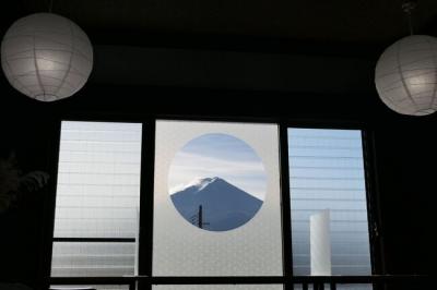 店内の奥にある窓には富士山の姿が円形の中に収まり、