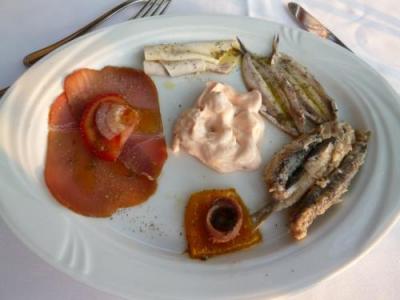 @前菜:魚介盛り合わせ…イワシのマリネ・イワシの南蛮風・イワシのオイル漬け・イワシのガーリック風フリット・イワシのチーズ詰めフリット・マグロの燻製・エビのカクテル風・白身魚のマリネ・ムール貝の詰め物