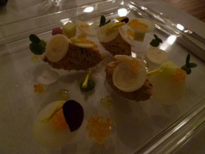 @Le Tourteaux et la mein de Budha/Coeurs de palmier frais et oeuf de truite/Granny Smith et christophine