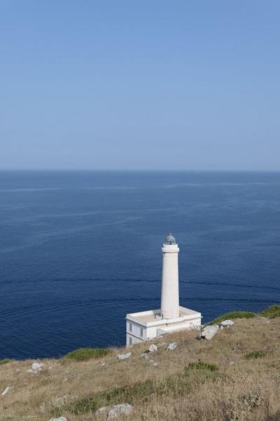 断崖上から、白い灯台と真っ青なアドリア海の絶景が広がります。