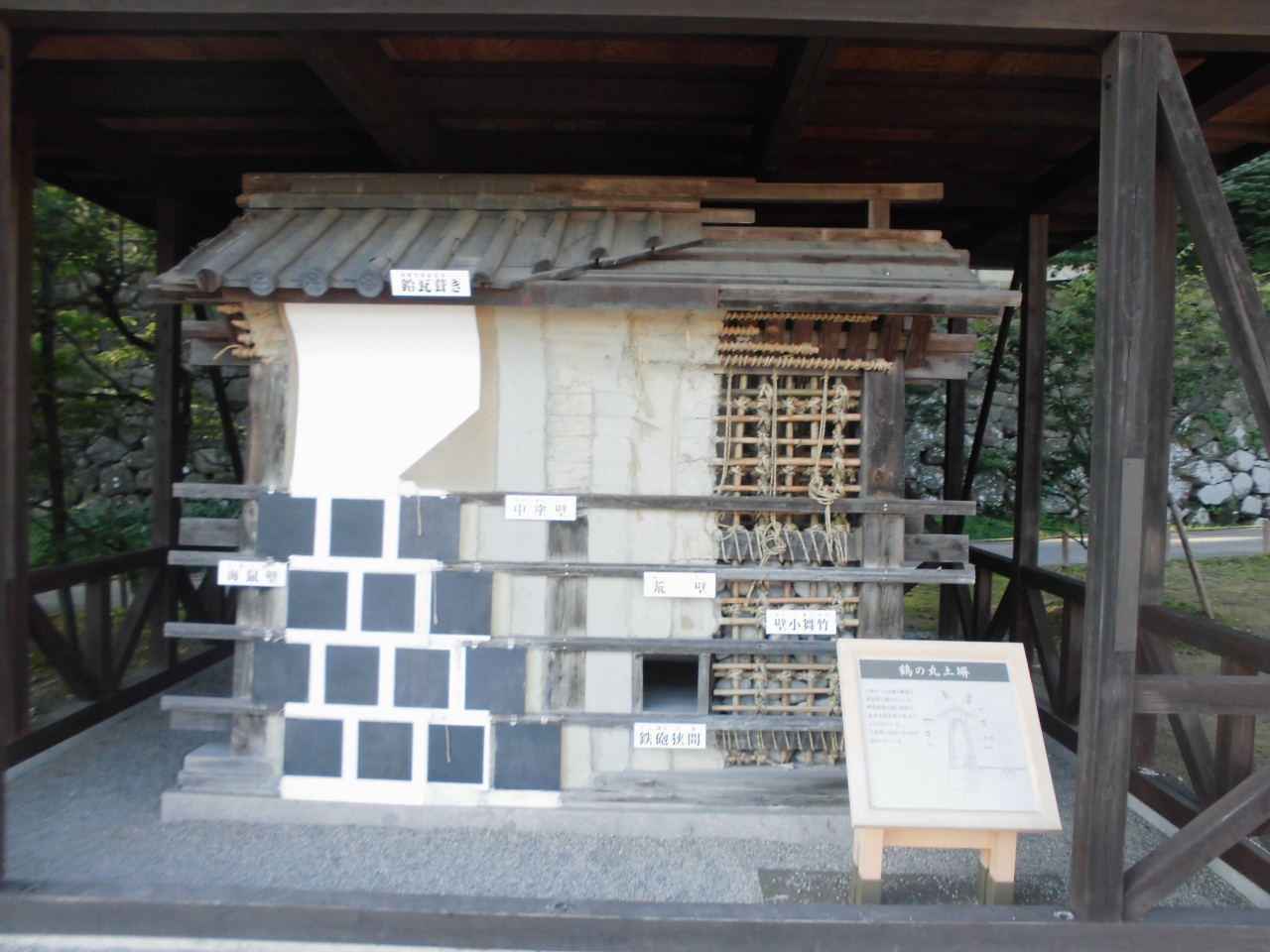 金沢城の一角に壁の説明がされている箇所を見つけました。そこでは屋根部分は鉛瓦葺きをしているとありました。耐性のためと城を美しくみせるためだったようです。百万石の威信がこんな細かい所に現れているとはと思いました。