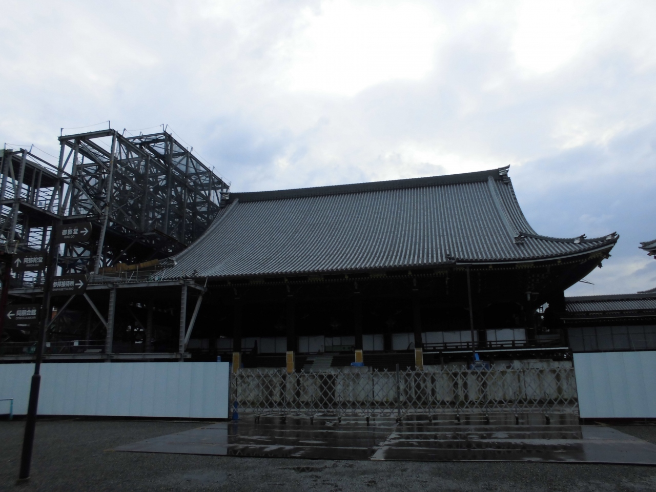 東本願寺の2つの大きな建物のうちの1つです。ですが、行った時はちょうど工事中で閉鎖でした。とはいえ工事中で見れないというタイミングで来るのは珍しいことであり、そういう意味ではプレミアだったと思います。普段見られない光景を見るのは幸せなことだと割り切れています。