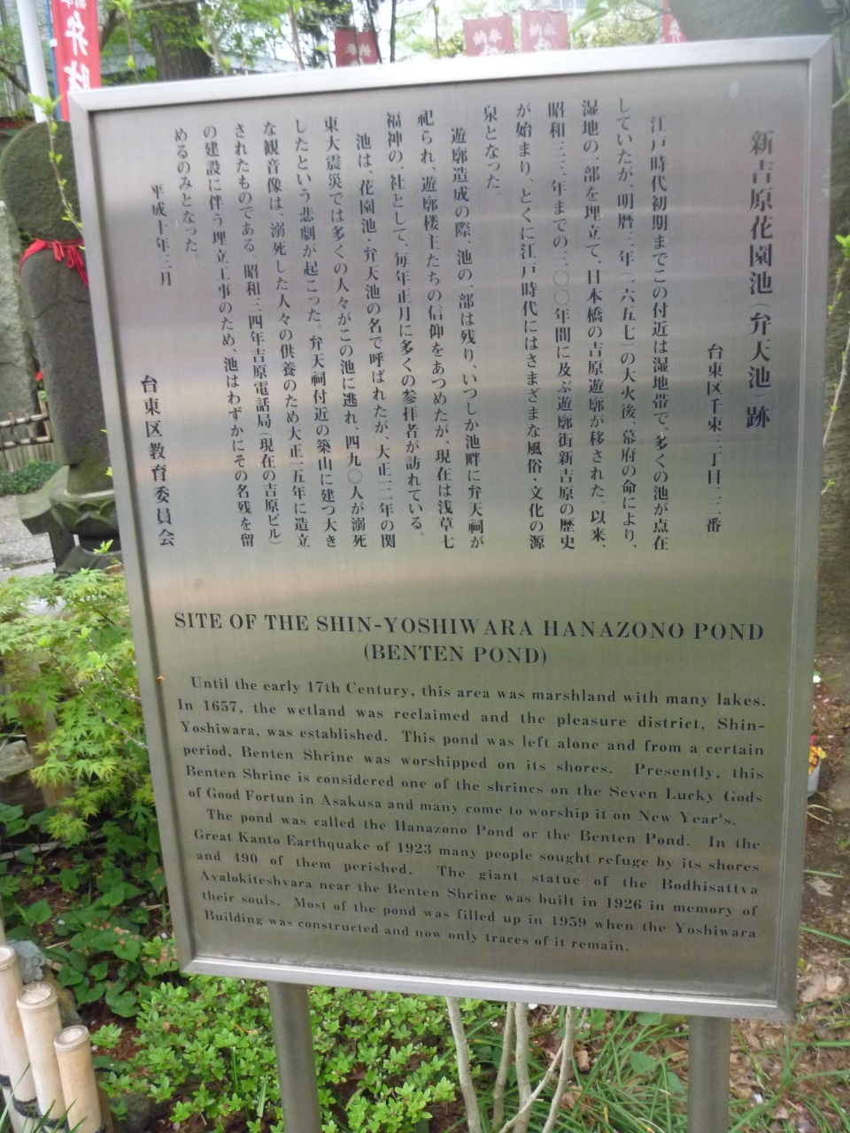歓楽街として有名な吉原ですが、周辺と同じく江戸時代には湿地でした。それを埋め立てて現在のようになったのですが、そのような状況でも残っていたのがこの大池です。残念ながらもう見る影もありませんが、池のあった歴史や、関東大震災の際の悲劇は伝える必要があると思いました。
