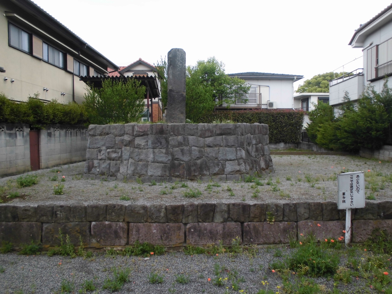 喜多院のすぐ近くにあります。周りは住宅街ですが、この一角は空き地のようになっており空き地の真ん中に立っているといったイメージです。なので裏側からも見ることができてそれだと何の碑かわからないこともあるので表に回り込むとよいようです。