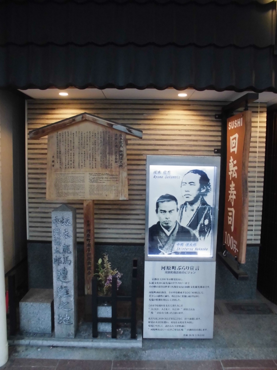 その名の通り坂本龍馬と中岡慎太郎が殺された場所です。河原町と言う市街地の一角にあり行きやすい場所なのですが、市街地ゆえなのか意外と探し出すのに時間がかかりました。丸山公園の像と言い、京都にはこの2人の組み合わせは意外と多いと感じました。