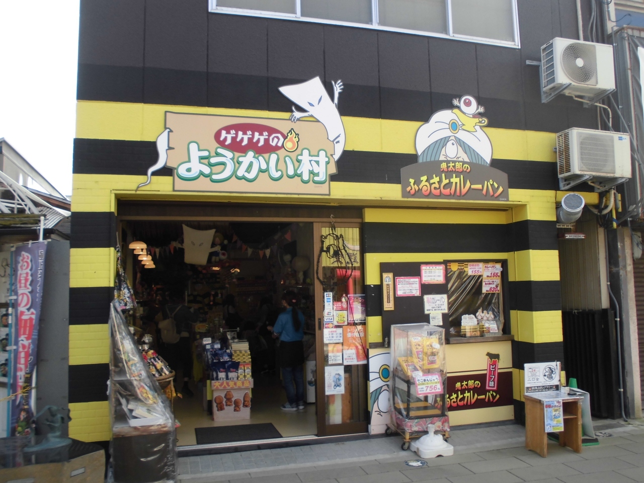 境港市は水木しげる先生の聖地と言うことで、水木先生のゲゲゲの鬼太郎のPRに力を入れています。商店が鬼太郎仕様になっていますが、この店はその中でも一番外装の鬼太郎化に力を入れていた気がします。鬼太郎のふるさとカレーパンが売っていたので買って食べました。きっと鬼太郎も作品の中で食べていたものと推測します。