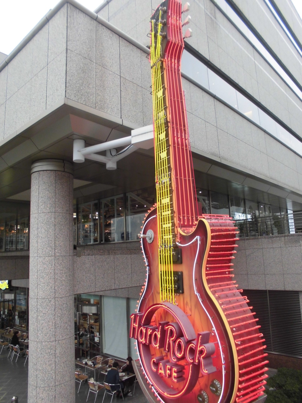 横浜みなとみらいにあります。一番目立つのはディスプレイのギターです。赤いボディーに弦は黄色いネオンになっています。非常に目立つ看板なのでたとえお店に入ることがなくともこれを見たら「あ、みなとみらいだ」と分かるランドマークです。