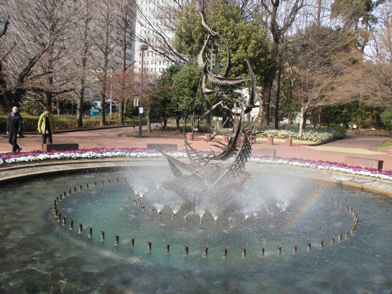 日比谷公園の最西端にある噴水です。厚生労働省・水産庁・中日新聞の向かいと言えばわかりやすいでしょうか?この噴水ですが、なんと形容していいのかわからないくらいの独特の形ですが、カモメがいくつかくっついたというのはわかります。それよりもきれいに水を噴出して虹が出ていてきれいでした。それで充分です。