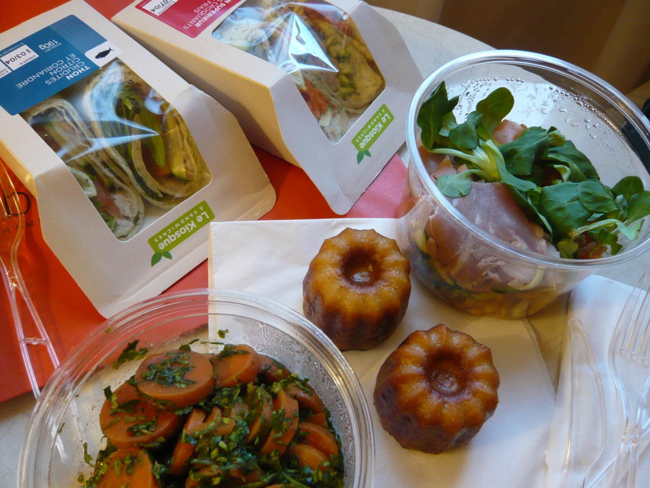 テイクアウトのサラダとサンドイッチとカヌレとスイーツを確保して