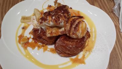 野菜がおしゃれに盛り付けされた野菜ジュースとフレンチトーストを注文。野菜ジュースは、あまり苦手な私でもおいしくのむことができました。最近東京ではやっているというフレンチトーストもとっても甘くておいしかった♪