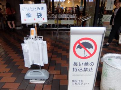 長い傘は持ち込み禁止なので空いている傘立てを捜さなければなりませんが、折り畳み傘は傘袋に入れて持ち込めました。